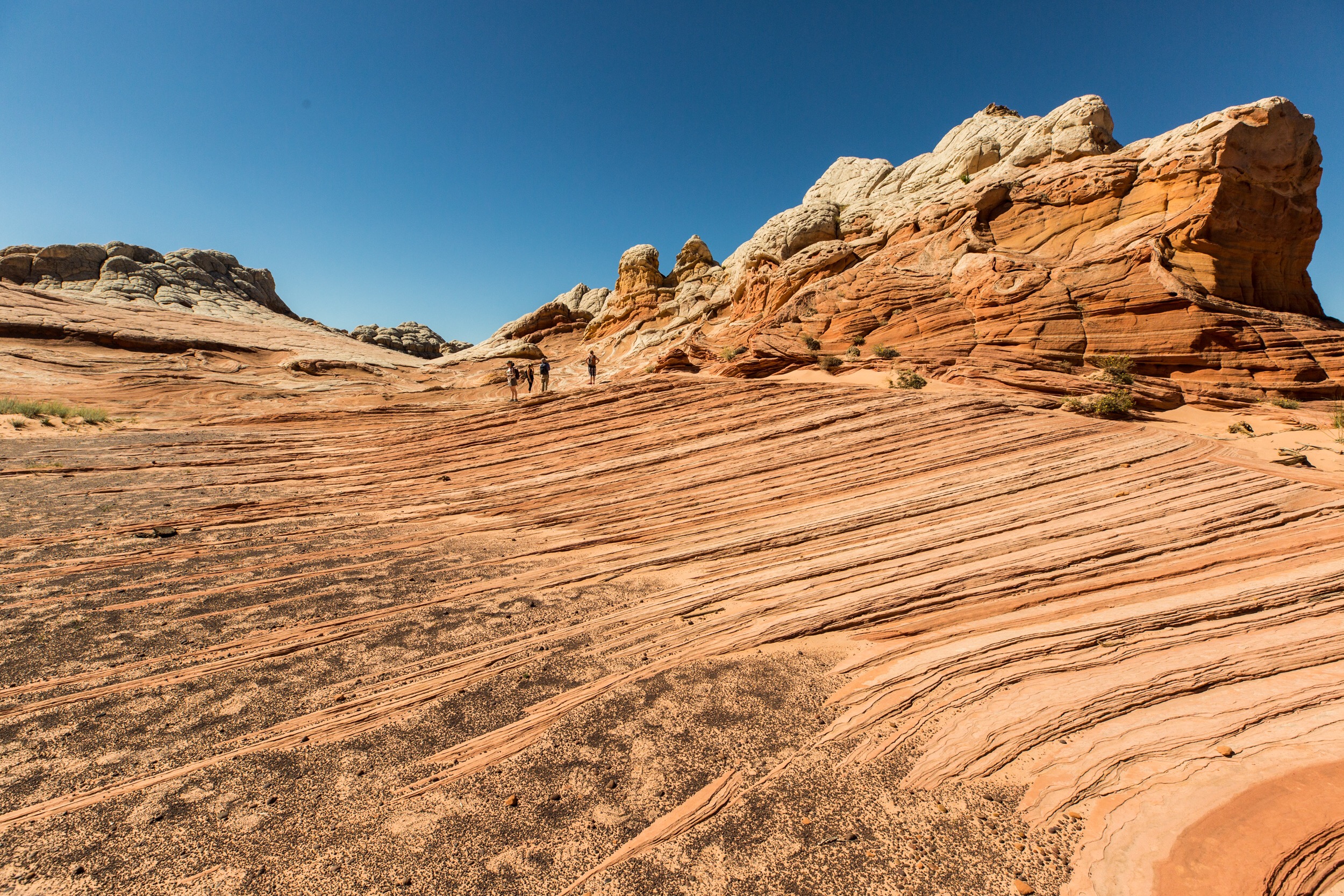 To be honest, the trailhead to White Pocket doesn’t look like much. There’s a small clearing for cars and a large, red stone cliff surrounded by heat and dry hearty vegetation. We took a brief detour to look at some petroglyphs- mostly Native American people informing each other that there are deer around- and then we moved on to White Pocket.