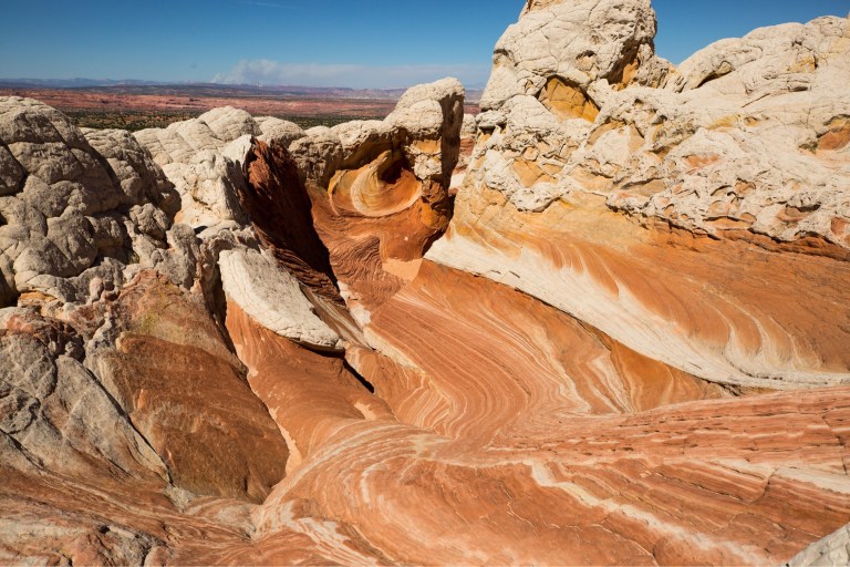 The drive to the trailhead of White Pocket gets slightly dicey once you’re off the paved highway and dirt road. We learned that tire pressure is good around 34psi in each before going on very soft sandy terrain. It took another 45 minutes to get to the beginning of our destination and we were all pretty happy to get out of the 4-wheel drive vehicle at this point. Our surroundings quickly changed from open space, to tall rocky mounds. White Pocket is known for the white “brain domes”, hoodoo structures, and red/orange gully’s that take you on a visual ride through the local earth history.